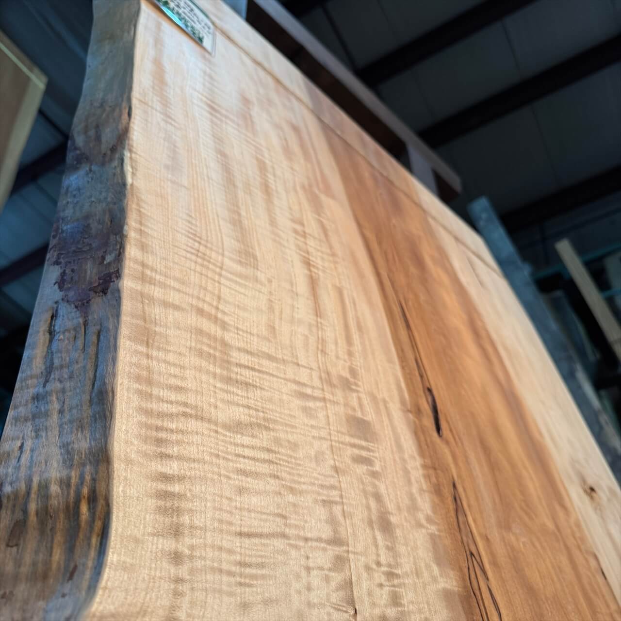 こちらは、赤身と白太のコントラストがくっきりと表れたトチの一枚板です。さらにオイル塗装によって、木目の立体感がより際立ち、縮み杢(ちぢみもく)や鮮やかなトラ目が浮かび上がってきました。