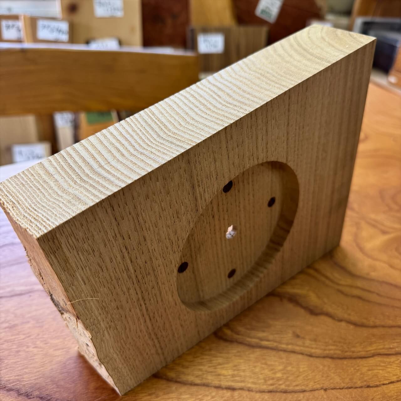 この時計は、製材や家具製作で切り落とされた小さな端材から生まれました。割れや虫穴など、木が歩んできた証をあえて残し、手を加えすぎず自然のままの風合いを大切にしています。