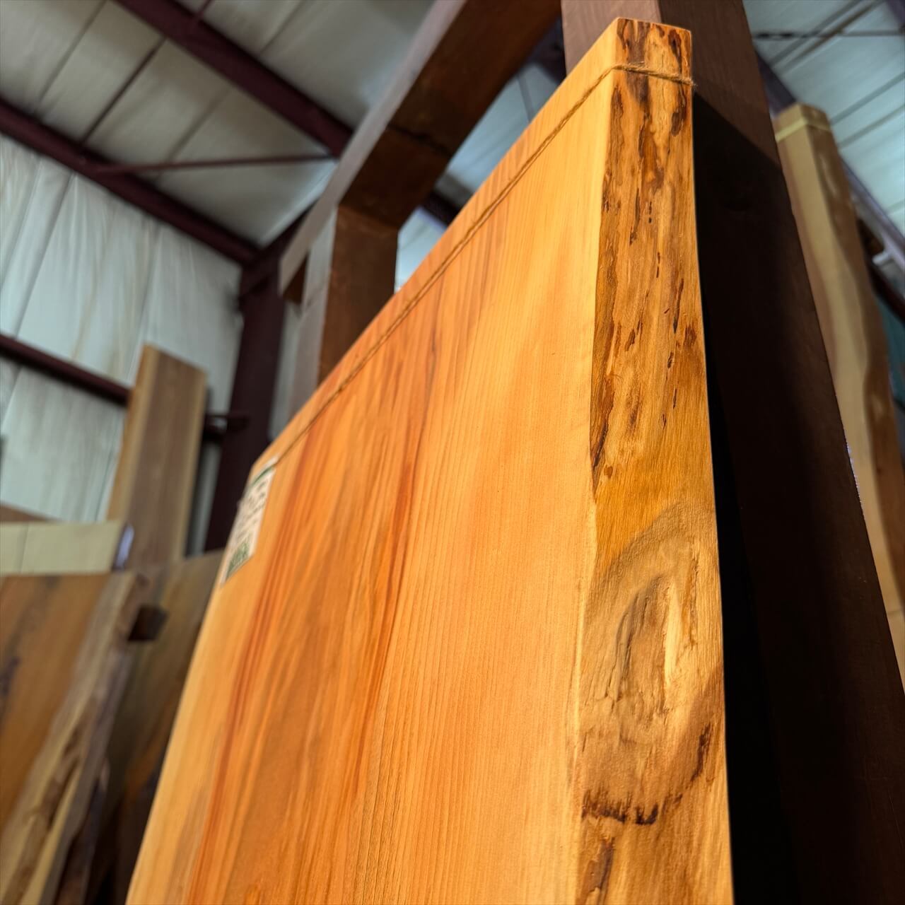 赤身部分の深みある色合いと白太との鮮やかなコントラストが際立ち、さらに青シミが加わり、ワイルドな個性を出しています。