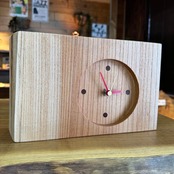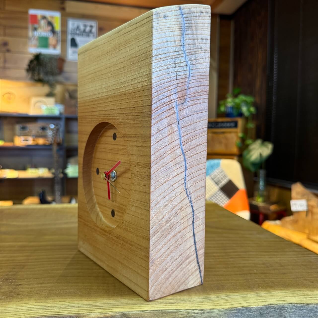 この時計は、製材や家具製作で切り落とされた小さな端材から生まれました。割れや虫穴など、木が歩んできた証をあえて残し、手を加えすぎず自然のままの風合いを大切にしています。デジタル全盛の時代に、アナログ時計が刻むわずかな“ずれ”もまた、暮らしの中の豊かな時間として楽しんでいただけます。
