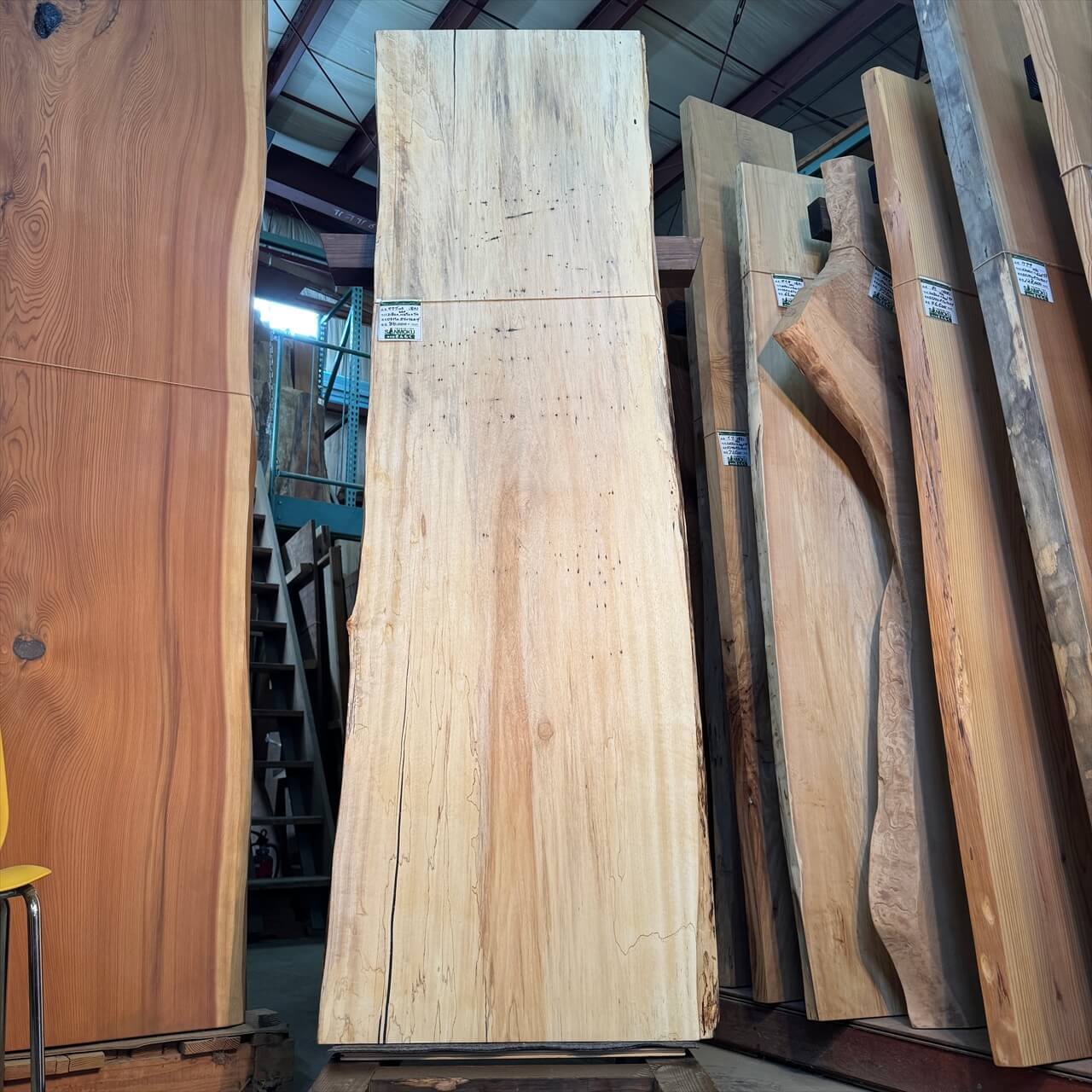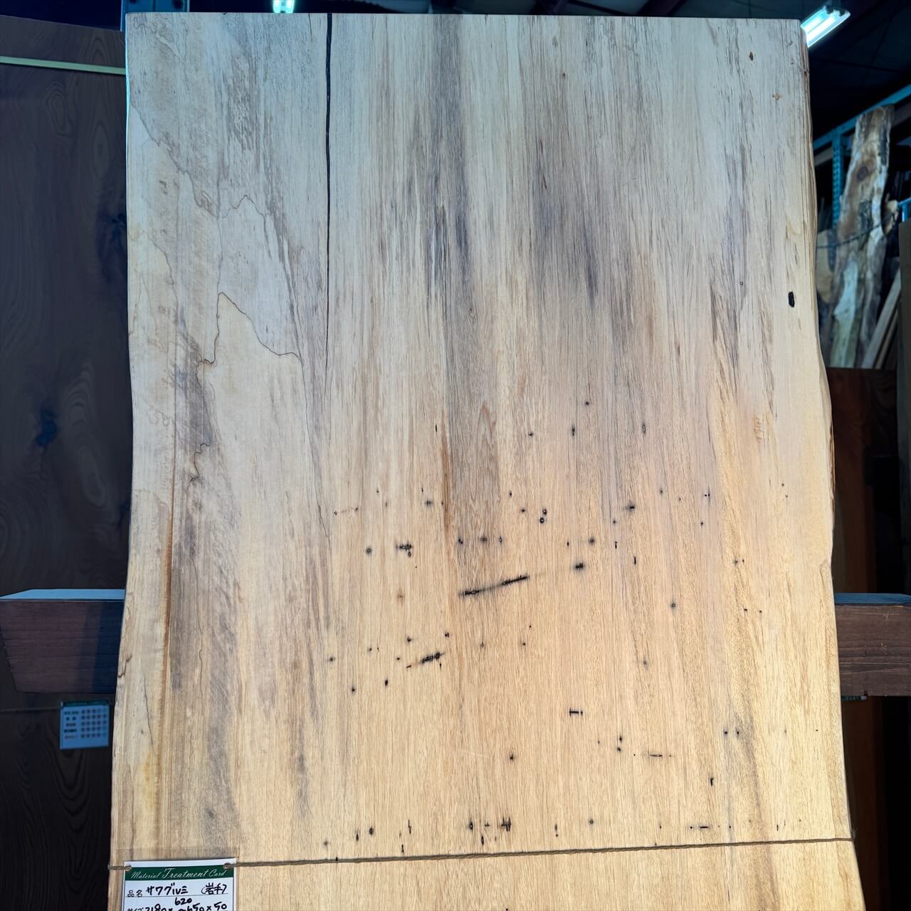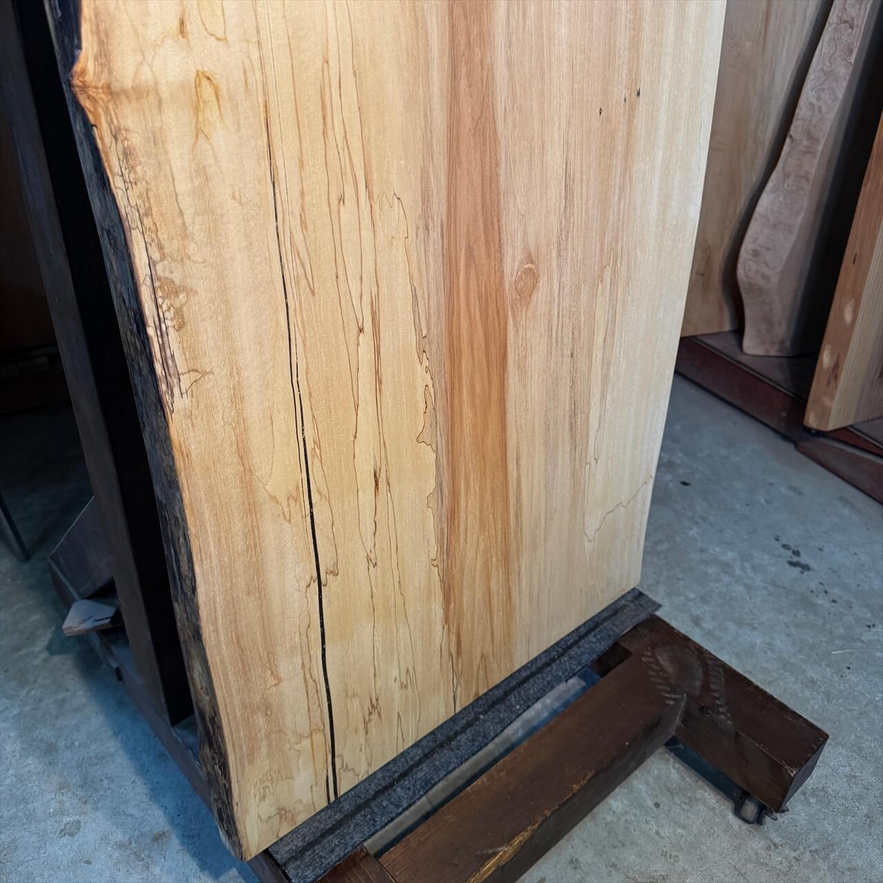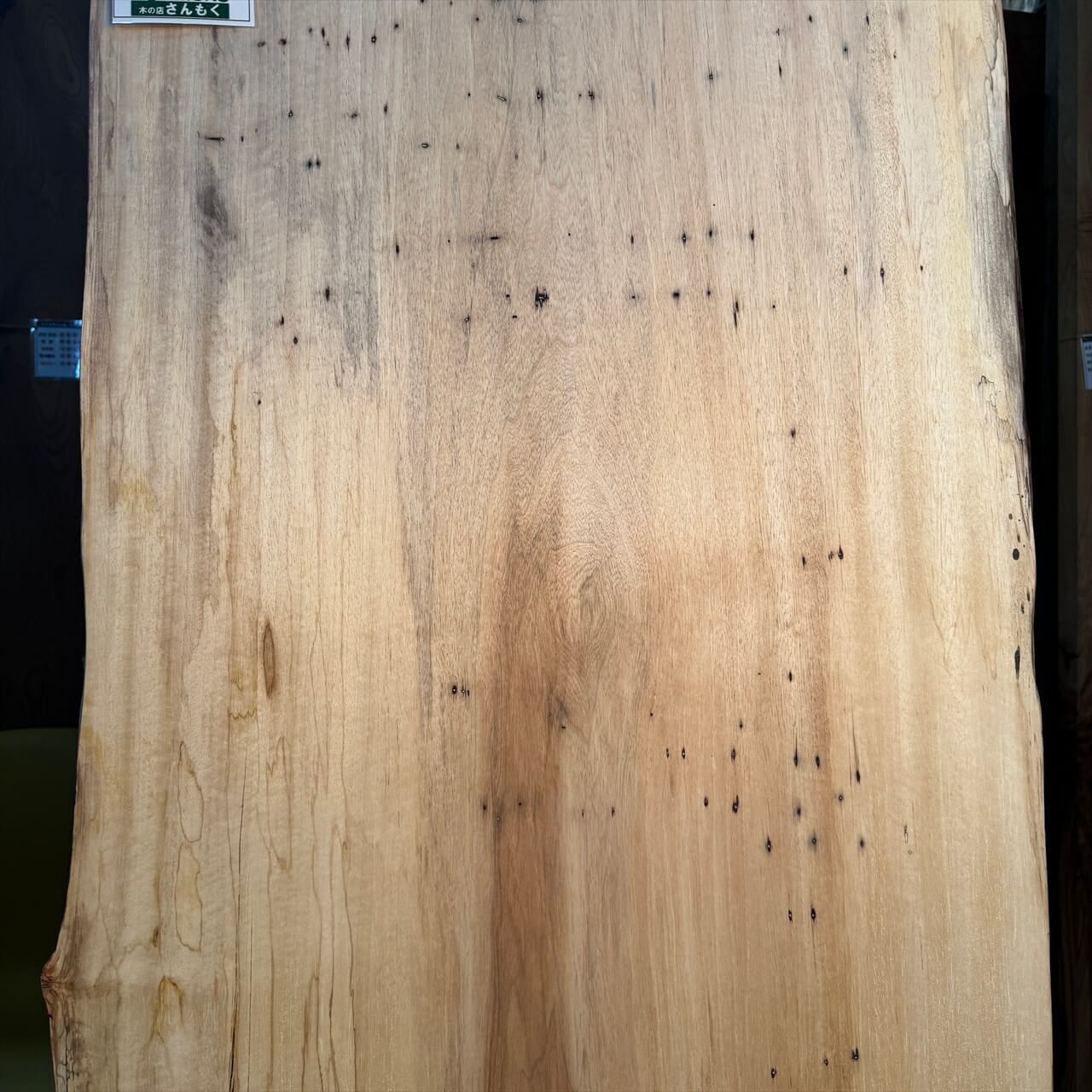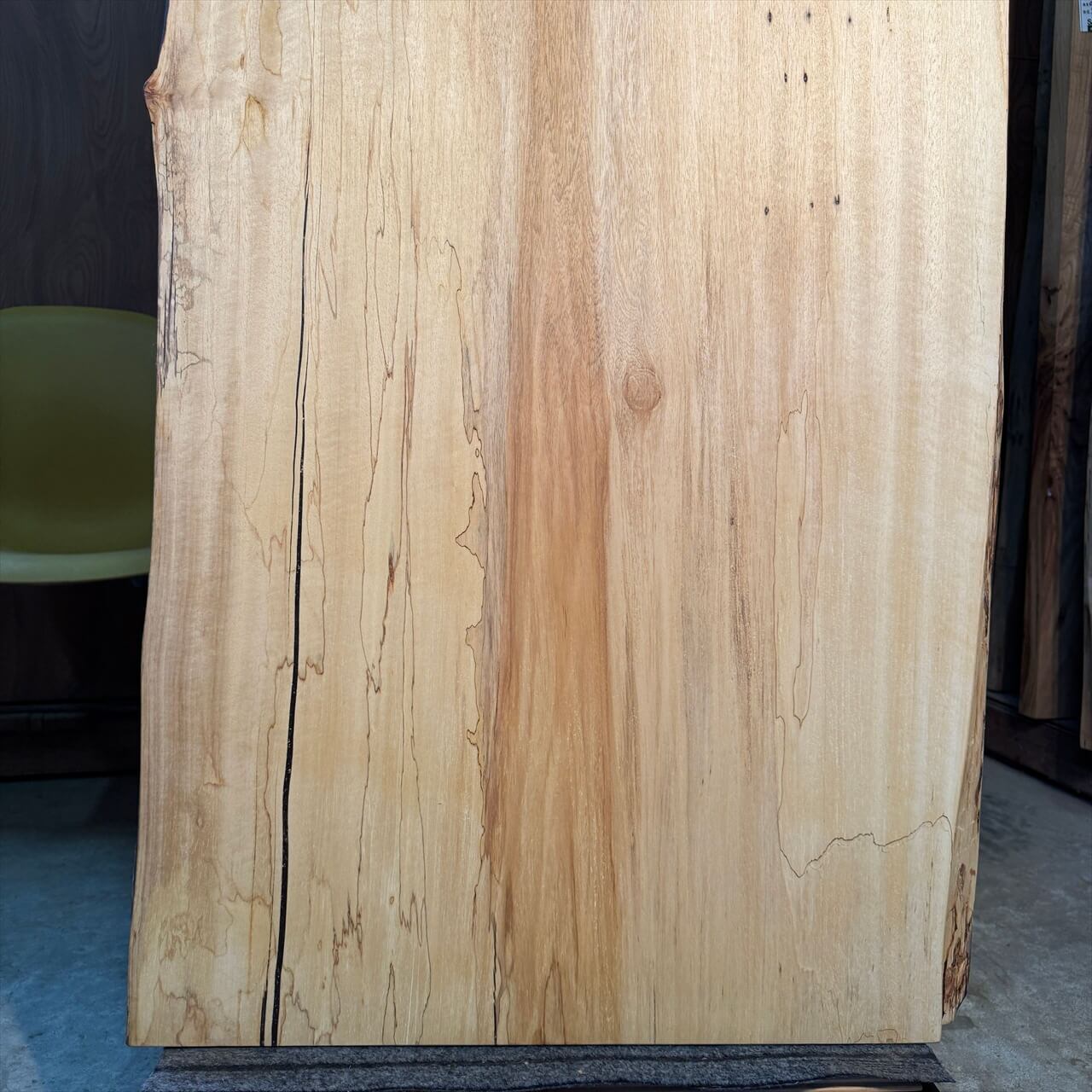 こちらの一枚板は、淡く年輪もみえないシンプルな大面に少しの赤身やスポルテッド、青シミ、そして無数のソバカスが散りばめられ、景色を構成しています。