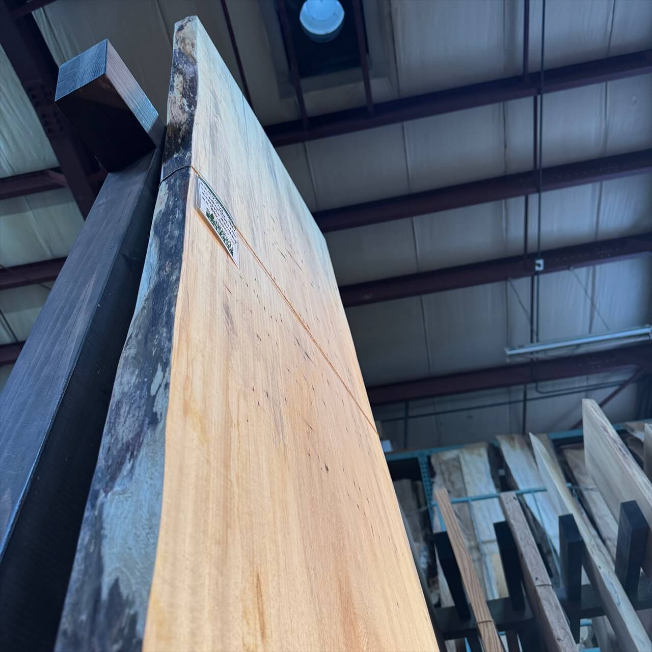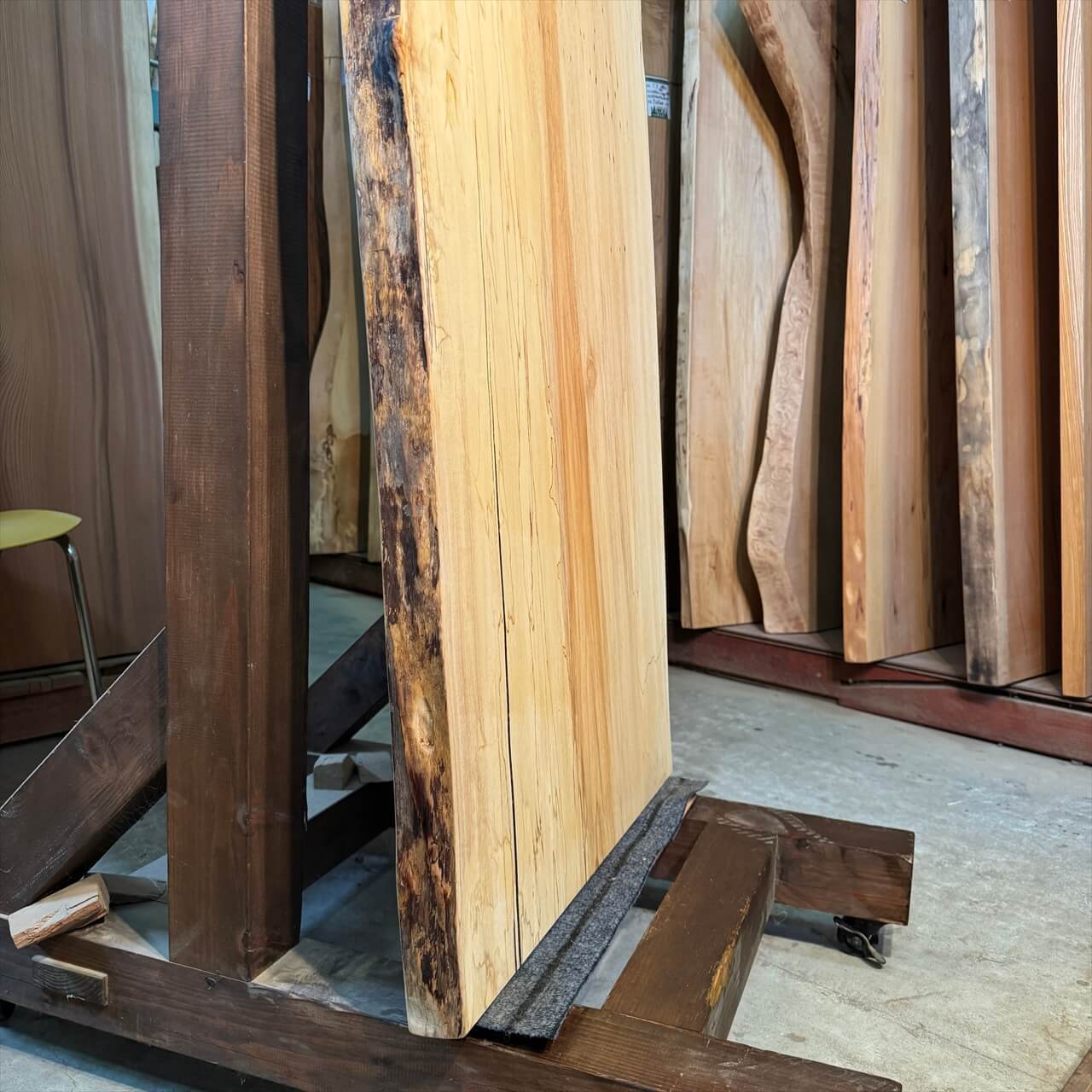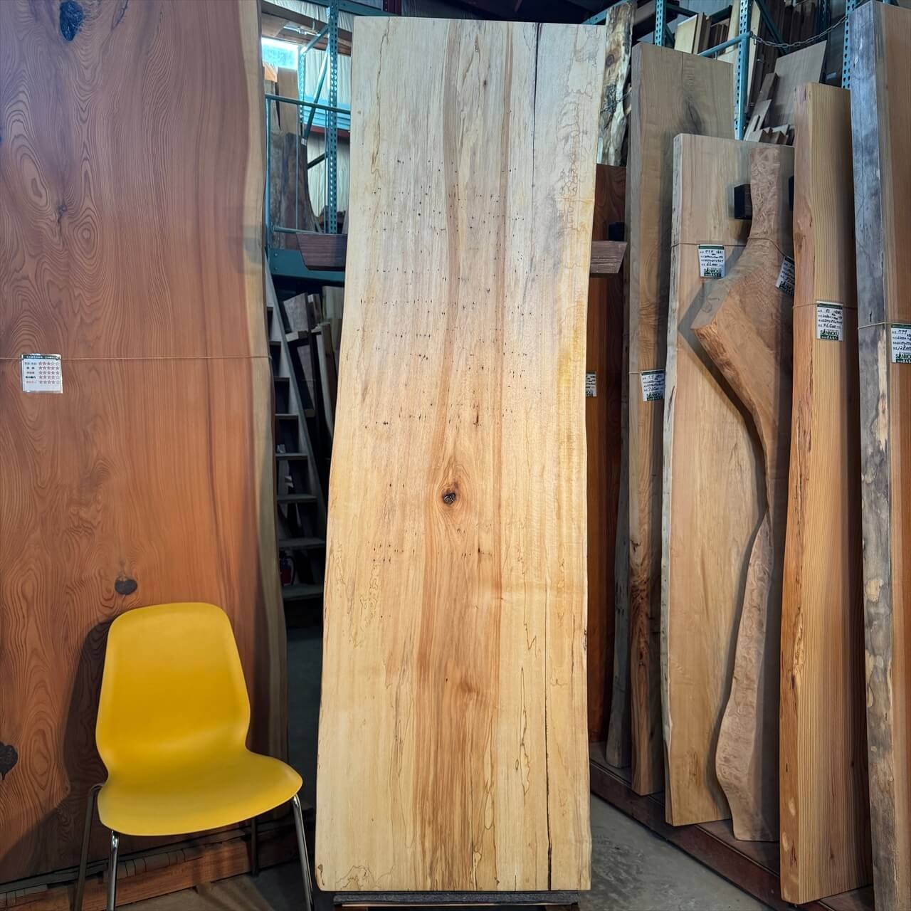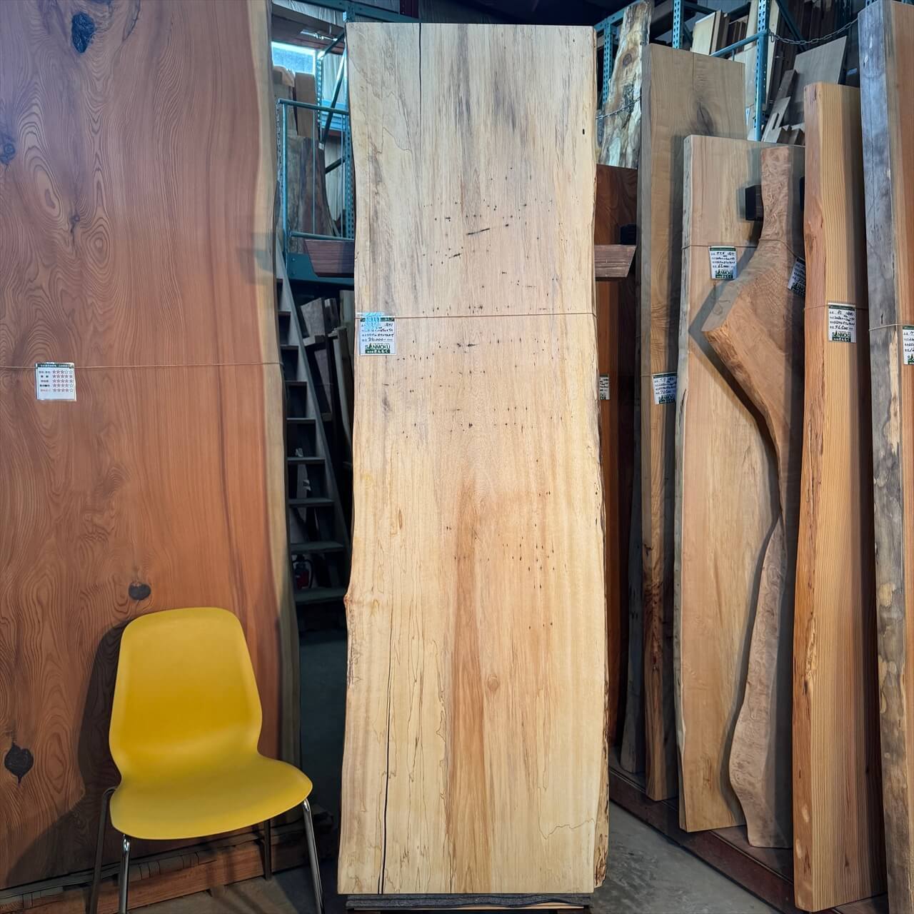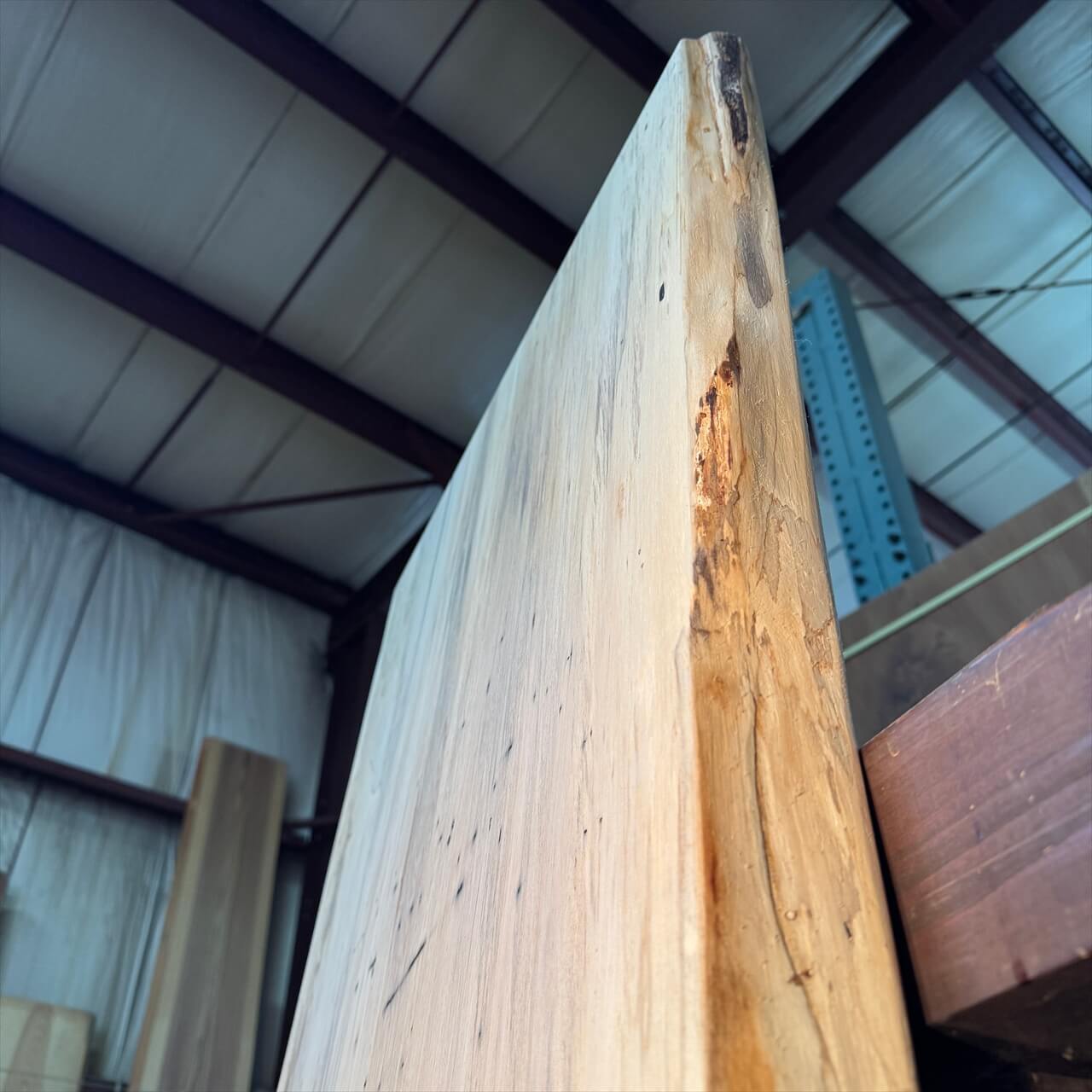こちらの一枚板は、淡く年輪もみえないシンプルな大面に少しの赤身やスポルテッド、青シミ、そして無数のソバカスが散りばめられ、景色を構成しています。