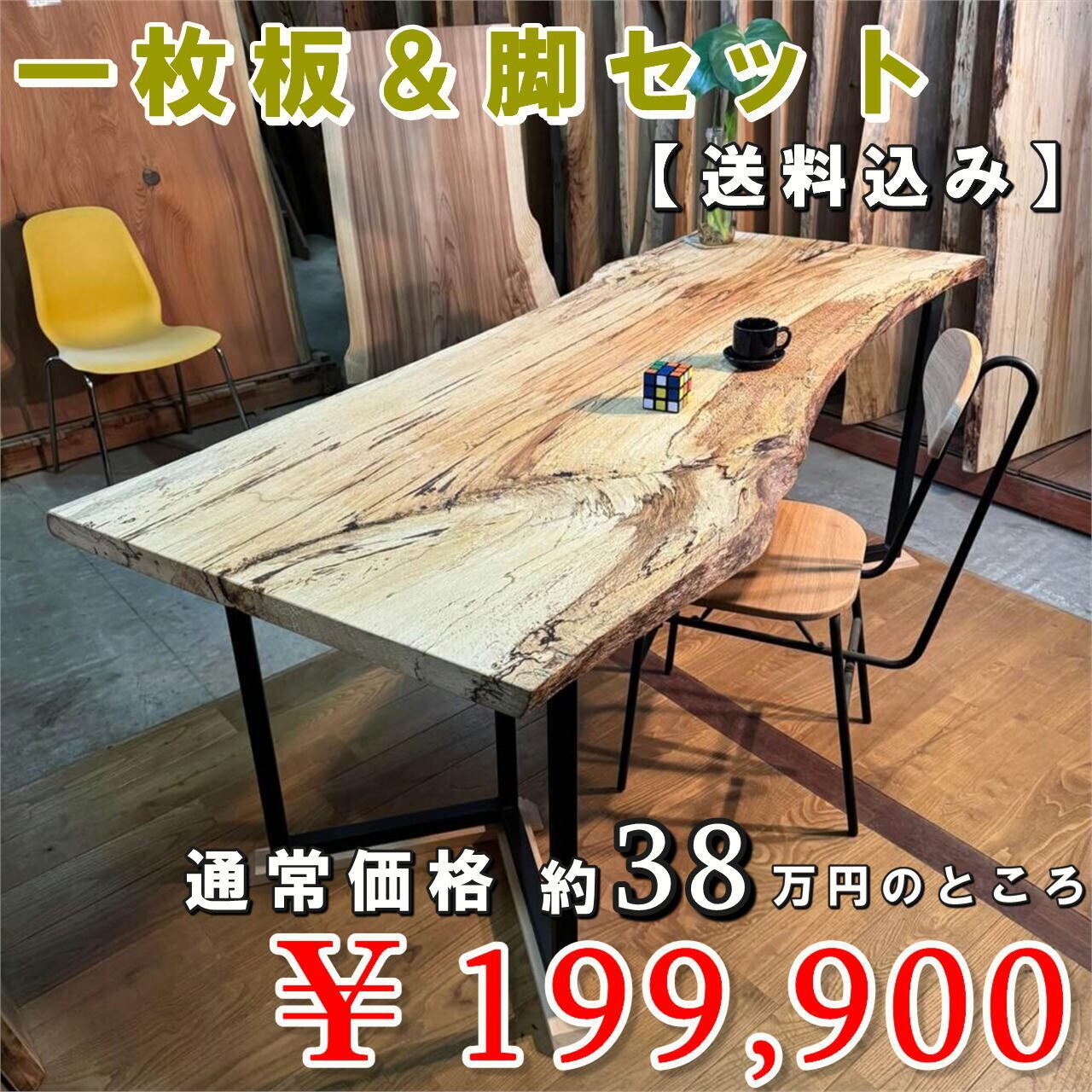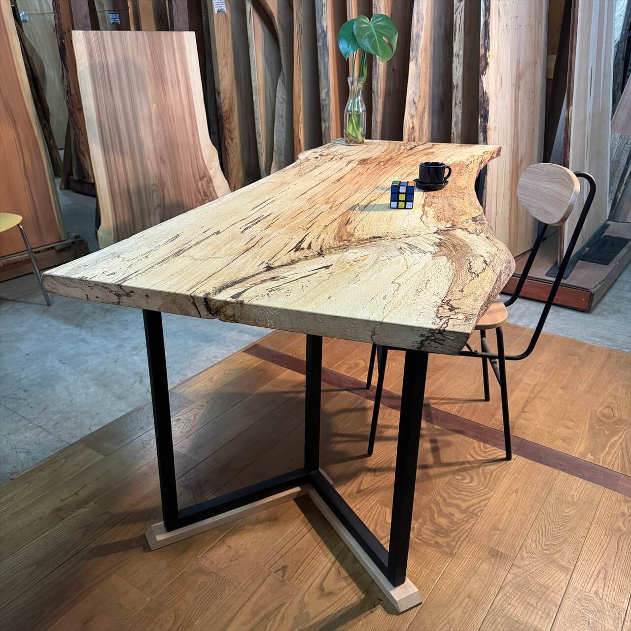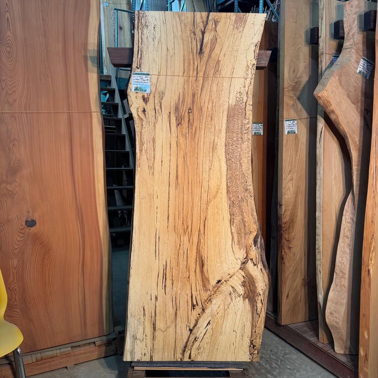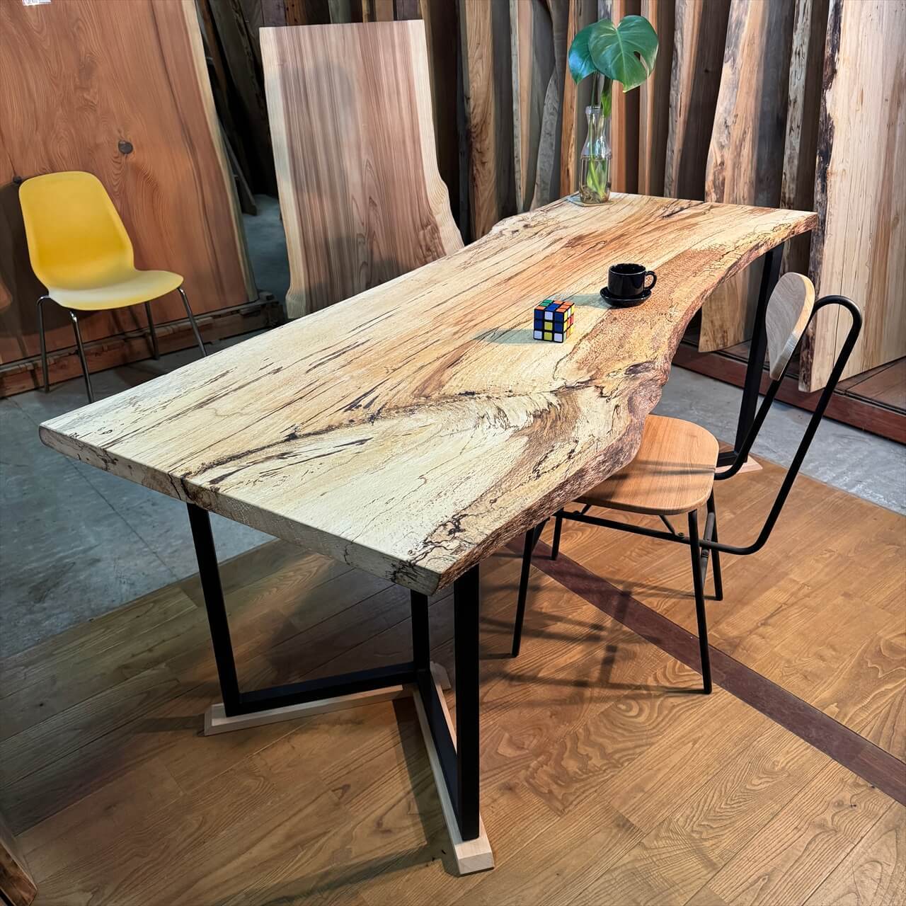 原木を製材したときから一枚板にしるされた熟成の跡、濃いシミや腐朽菌が紋様になった「スポルテッド」が前面にあらわれていて、普通の一枚板とは一線を画す独特な雰囲気の一枚板です。