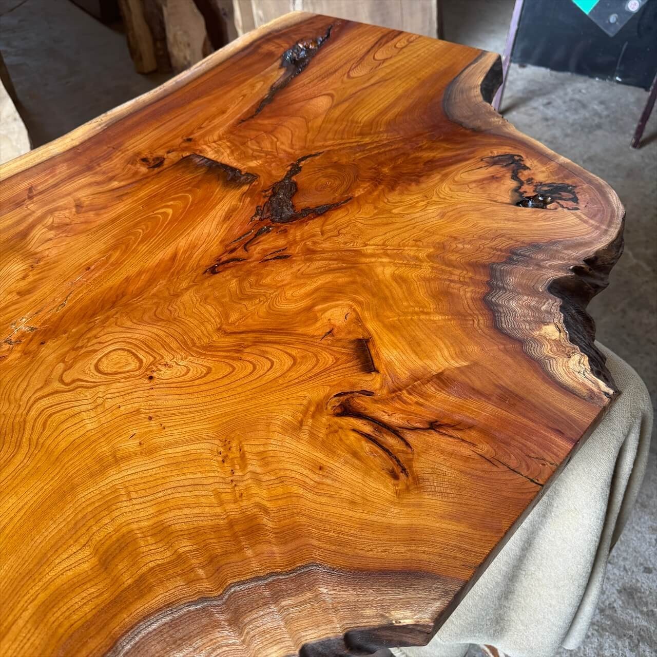 老木のケヤキならではの高樹齢で細かな年輪に加え、入り組んだ木目や朽ちたところがあちらこちらに見えて、どこを見ても見飽きない一枚板です。